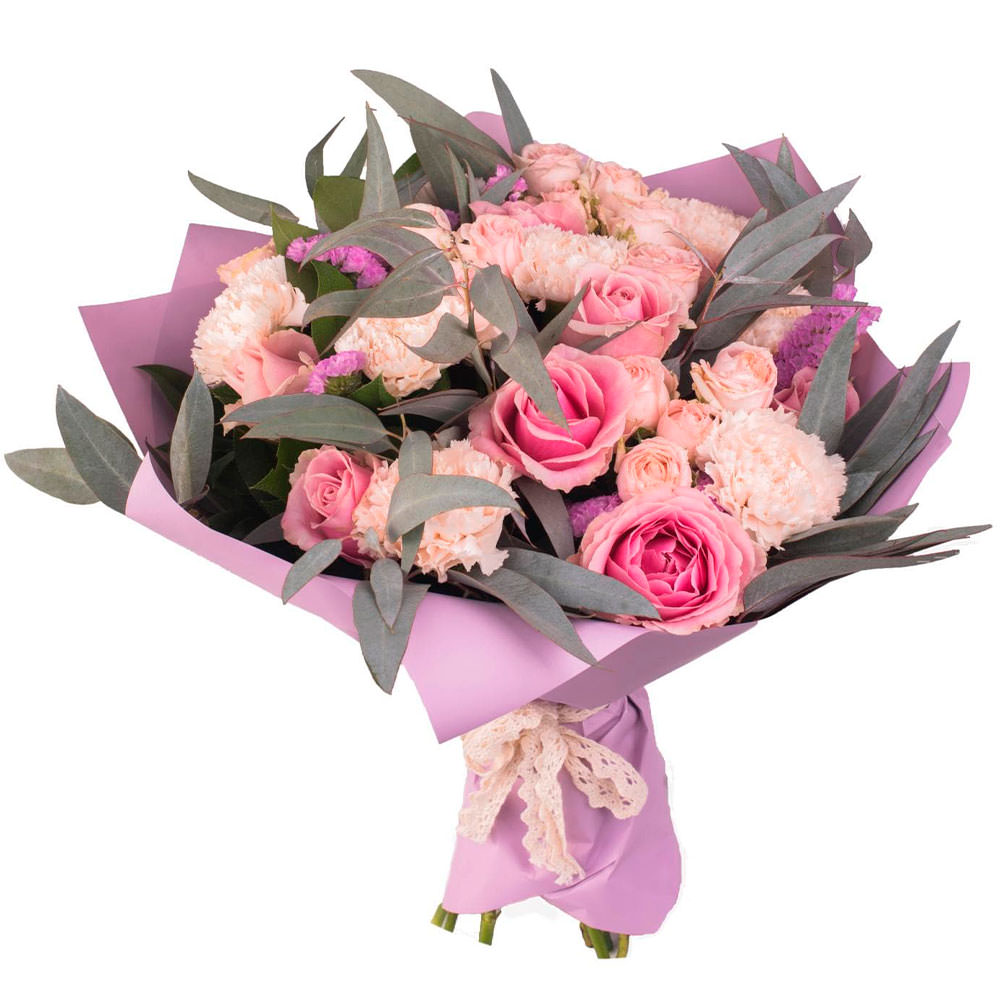 Роза одноголовая розовая, гвоздика розовая, статица сиреневая, эвкалипт. Упаковка (лента, пленка, крафт, сетка, пленка матовая)