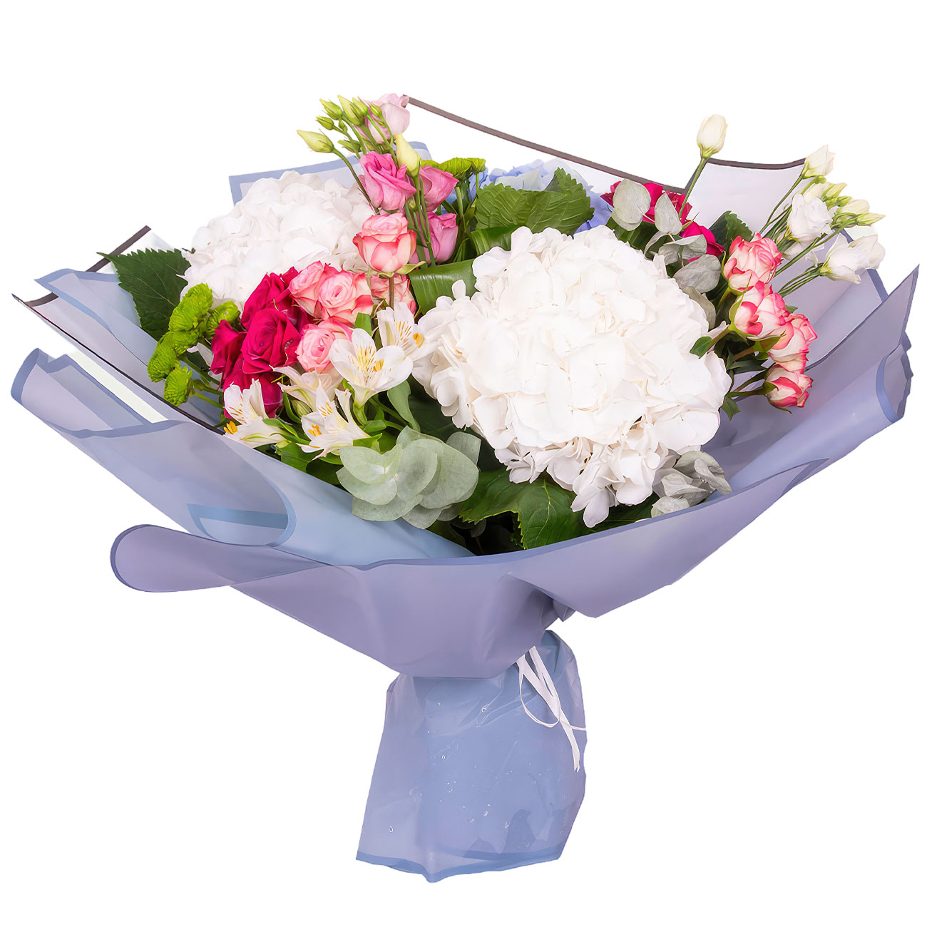 Гортензия белая, эустома розовая, альстромерия белая, роза кустовая розовая и бело-розовая, эвкалипт, сантини, аспидистра. Упаковка (лента, пленка, крафт, сетка, пленка матовая)